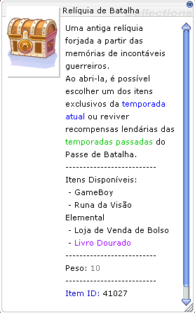 A Relíquia de Batalha é um item especial do Passe Premium que permite ao jogador escolher 1 entre 4 itens exclusivos, cada um focado em qualidade de vida, praticidade e eficiência durante o jogo.
