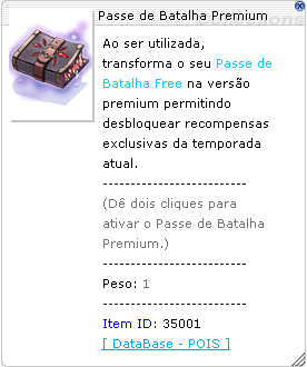 O Usuário Premium tem acesso ao Passe de Batalha, um sistema de progressão que recompensa o jogador conforme ele avança níveis, oferecendo itens extremamente úteis para UP, farm, refino e qualidade de vida.